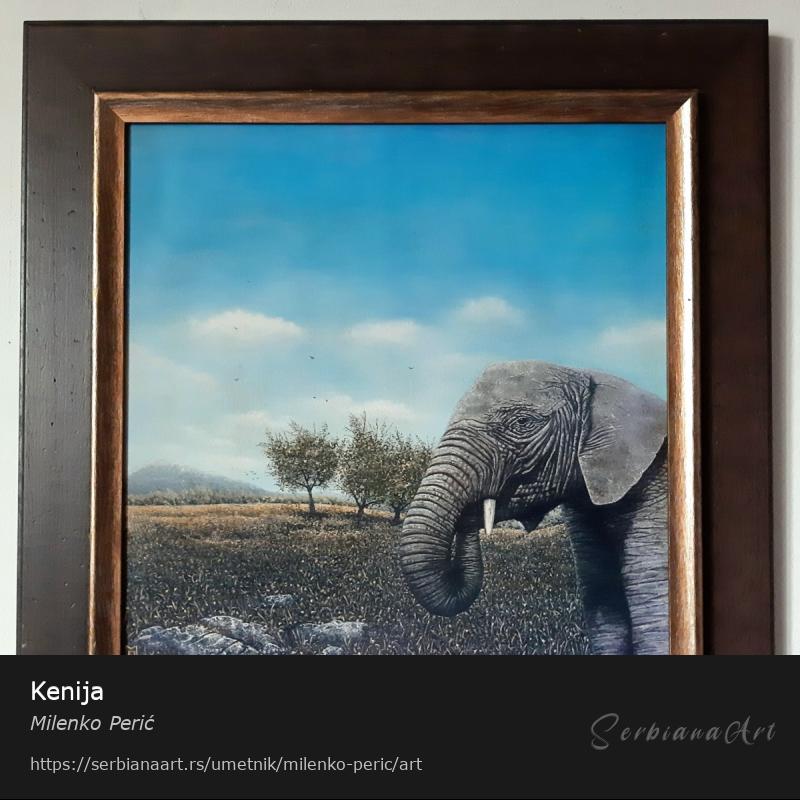 Kenija, 40x40, monotipija na platnu sa doslikanim detaljima, uramljena, sa mesinganom pločicom.