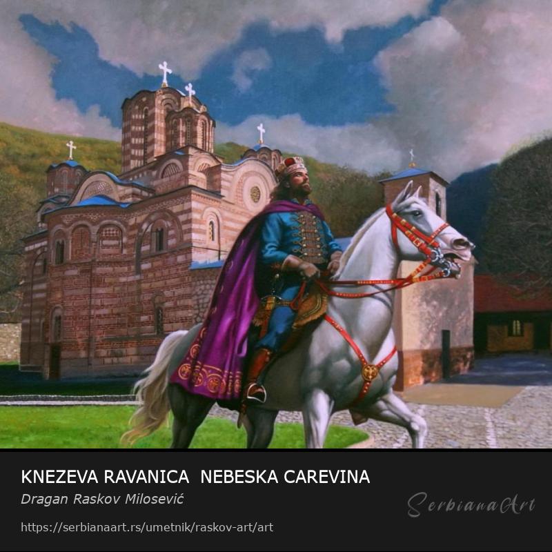 Na slici je prikazan Knez Lazar na konju ispred Manastira Ravanice.