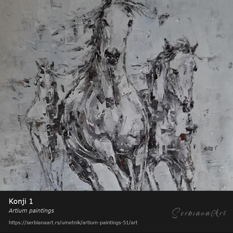 Slika ``Konji 1`` je monohromatska. Rađena je u nijansama toplih, sivih tonova sa akcentovanim detaljima. Uklapa se kako u klasičan tako i u moderan enterijer.Podelite i promovišite ovo delo