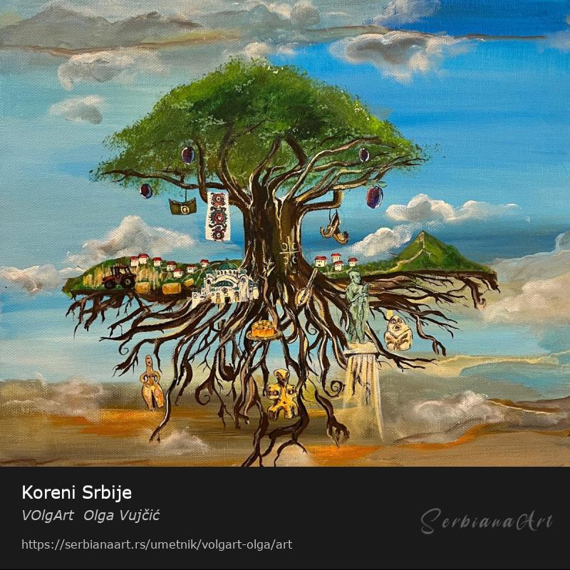 Ovo je slika dubokih korena, bukvalno i metaforično. Masivno drvo dominira kompozicijom, sa krošnjom koja se širi prema nebu, dok se njegovi ukorenjeni prsti pružaju u prošlost, u tradiciju, u temelje jednog . U krošnji se prepoznaju delovi kulture, dok se ispod zemlje, u lavirintu korenja, nalaze figure koje svedoče o prošlim vremenima – Vinčanska figurina, monumentalni spomenici, sveti hramovi.
