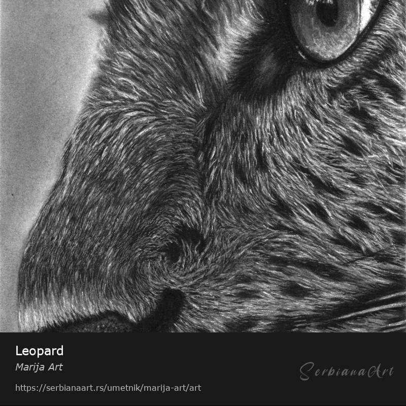 Crtež leoparda, rađen grafitnim olovkama i ugljenom, veličina 47 x 55 cm. Rađen na kvalitetnom papiru Fabriano smooth.