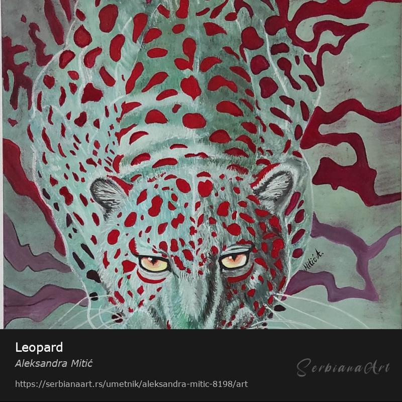 Delo "Liquid Leopard" prikazuje leopardovu glavu u nadrealnom, gotovo tečnom pokretu boja. Crvene šare i zelene nijanse stvaraju snažan kontrast i doživljaj energije u pokretu. Slika nosi simboliku snage, instinkta i fluidnosti života, izraženu u modernom, apstraktno-naivnom stilu.