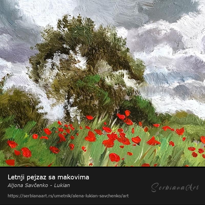 Ova ekspresivna pejzažna slika prikazuje polje jarkocrvenih makova koje se njišu pod teškim, oblačnim nebom. Guste poteze četkice daju teksturu i pokret travi i drveću, dok dramatični oblaci nagoveštavaju dolazak oluje. Snažan kontrast između crvenih cvetova i sivog neba unosi emotivnu tenziju i lepotu u ovu impresionističku kompoziciju.