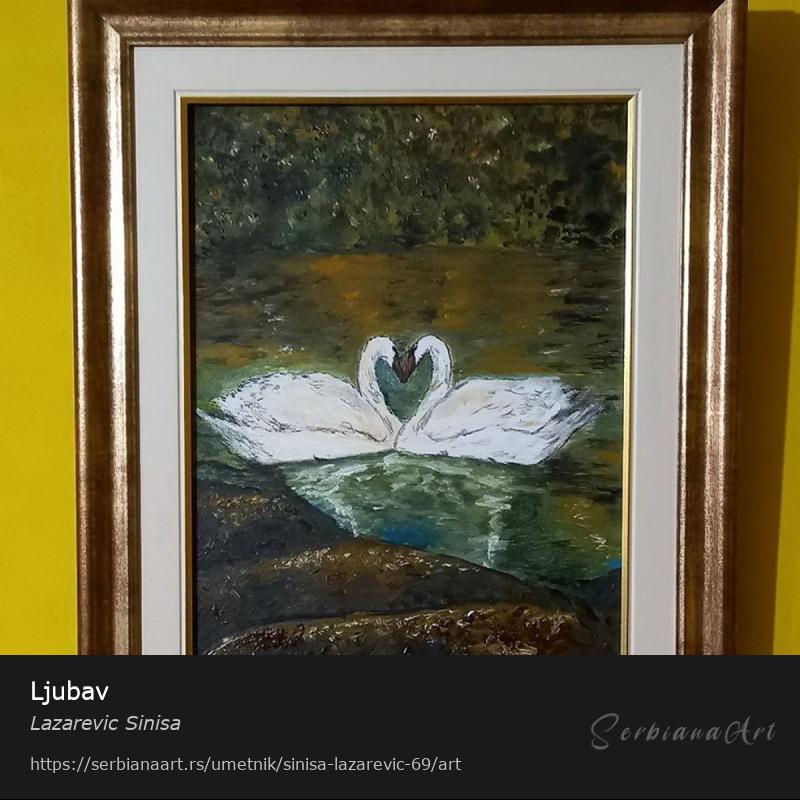 U slici"Ljubav"koristio sam slikarsku tehniku ulje na latnu da bi prikazao dva labuda u trenutku nežnosti i romantike.Kompozicija je simetrična, sa dva labuda u centru slike koji su okruženi nežnim i mekim pastelnim bojama.Svetlo se preliva preko površine vode,stvarajući odsjaj koji je skoro nadrealan.Laganim potezima četkice,stvarao sam osećaj lakoće i lepršavosti.Ova slika predstavlja lepotu i jednostavnost ljubavi,koja može pronaći svoj put čak i u divljini prirode.Original slika sa potpisom