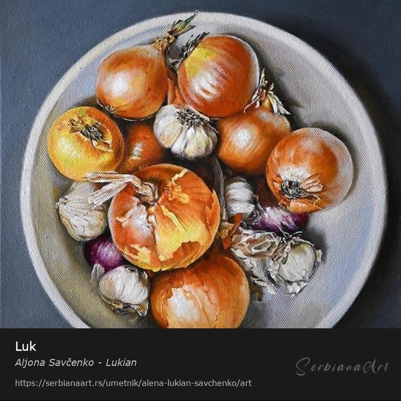 Ova umetnička slika prikazuje zreli luk, naslikan tehnikom ulja na lanenom platnu. Realistični detalji i pažljivo senčenje donose osećaj teksture i prirodne lepote ovog svakodnevnog predmeta. Kompozicija naglašava jednostavnost i eleganciju prirode, pretvarajući običan motiv u umetničko delo koje privlači pažnju.