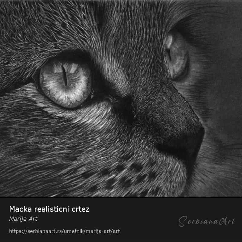 Realistični crtež mačke, rađen grafitnim olovkama i ugljenom na kvalitetnom Fabriano papiru. Veličina 23 x 18 cm. Crtež nije uramljen i šalje se u zaštitnoj tubi.