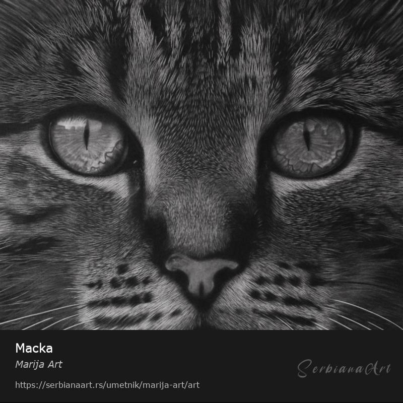 Realistični crtež mačke, rađen grafitnim olovkama i ugljenom na kvalitetnom Fabriano papiru 100 % pamuk, 300g. Veličina 56 x 60 cm. Crtež nije uramljen i šalje se u zaštitnoj tubi.