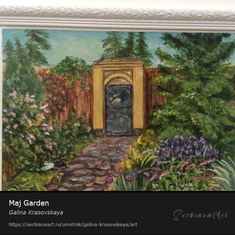 Slika prikazuje šarmantnu prolećnu baštu koja se budi pod blagim suncem. Prvi nežni cvetovi cvetaju duž staze koja vodi do drevnih kapija, kao da pozivaju putnika u nepoznato. Bogato zelenilo i ljubičaste i ružičaste nijanse cveća stvaraju osećaj mira i svežine, dok treper svetlosti na tamnim kapijama obećava nova otkrića izvan bašte.