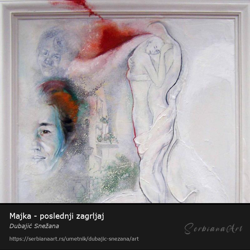 Snezana DubajicRodjena sam, zivim I radim u Beogradu. Slikarka sam pedeset godina. Pokojni akademski slikar Cvetko Lainovic je bio moj mentor, jos iz detinjstva,kada je prepoznao u meni talenat. Sve do njegove smrti , bio je prisutan u svim mojim fazama, eksperimentima. Saljem Vam pismo koje je ostalo iza njega iz 1997.Izlagala sam od 1984-1987 u SFRJ (Sarajevo, Dubrovnik,Split) Beograd, I u Svajcarkoj (Bil,Bazel,Arrow).1988. otvorila sam kreativni kutak koji se zvao Sindjel Scena, gde se slikalo, dizajniralo, radjen je mermer,...
