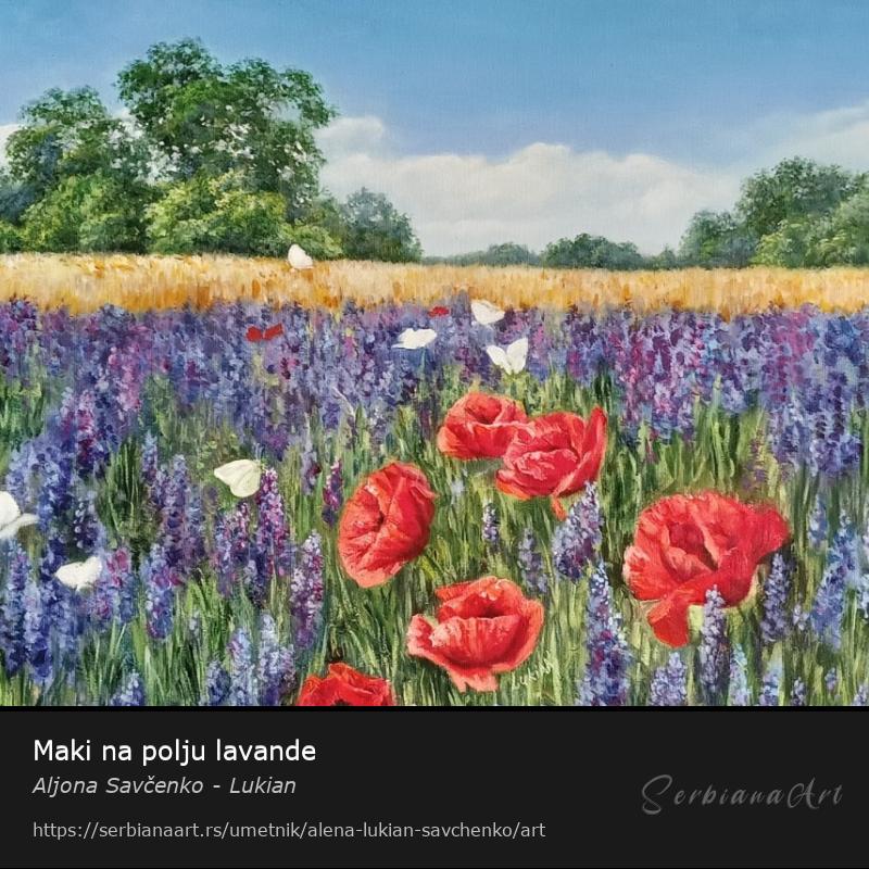Ova originalna uljana slika na platnu prikazuje živopisne crvene makove na polju lavande, sa nežnim prelazima boja i svetlosti koji stvaraju mirnu i romantičnu atmosferu.