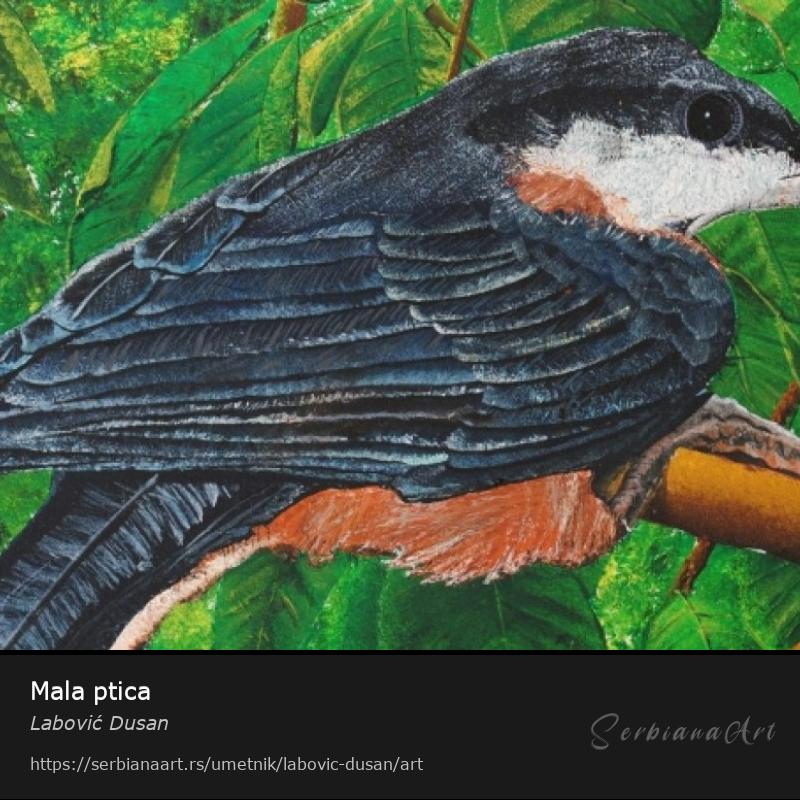 Prikazana mala ptica na grani – u prirodnom okruženju , primetni detaljni pogotovu glave ptice kao i obeležja perspektive.Predivna slika patke koja izvodi pačiće na plivanje . Dočarava život ptica u prirodnom okružnju , a na slici kao da se vidi užurbanost ptića dok ne dođu u zaklon šiblja.
