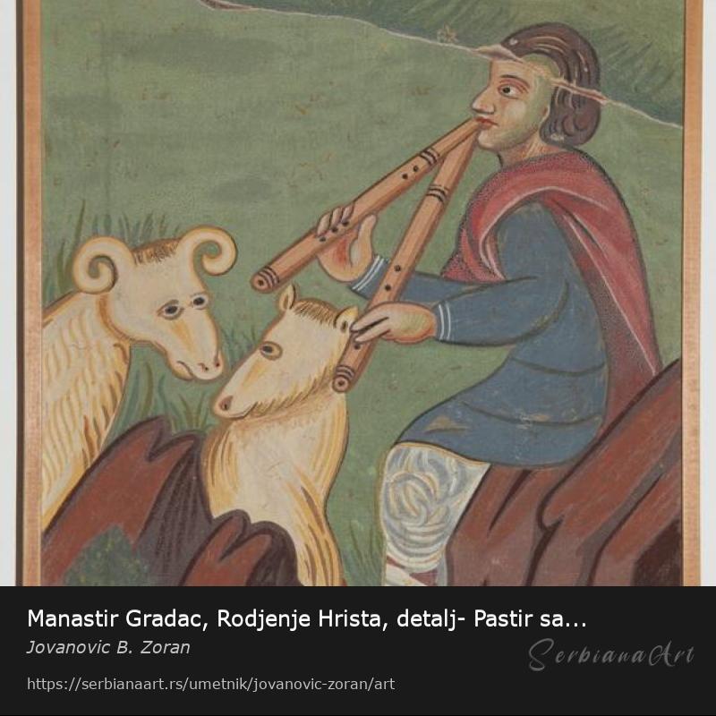 Manastir Gradac (1270-1275.god.), Rođenje Hrista, detalj: Pastir (koji svira u dvojnice ), sa ovcama, kopija freske. Ova kopija freske je u posedu autora, a rok za izradu iste je po dogovoru (oko 25 dana).