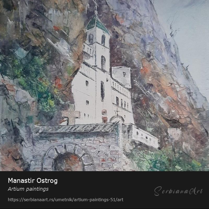 Slika ``Manastir Ostrog`` je prikaz jednog od najposećenijih manastira smeštenog uz skoro vertikalnu liticu planine.Podelite i promovišite ovo delo