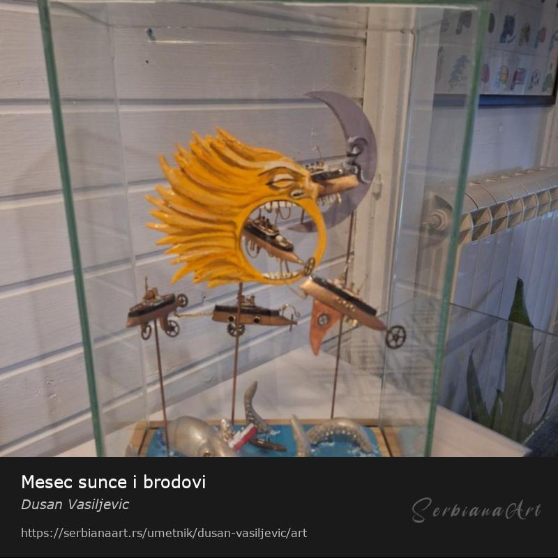 Skulptura je izradjena od kombinovanih materijala (drvo,metal) ofarban akrilnim bojama. Kompletna rucna izrada pocevsi od nacrta do modela.