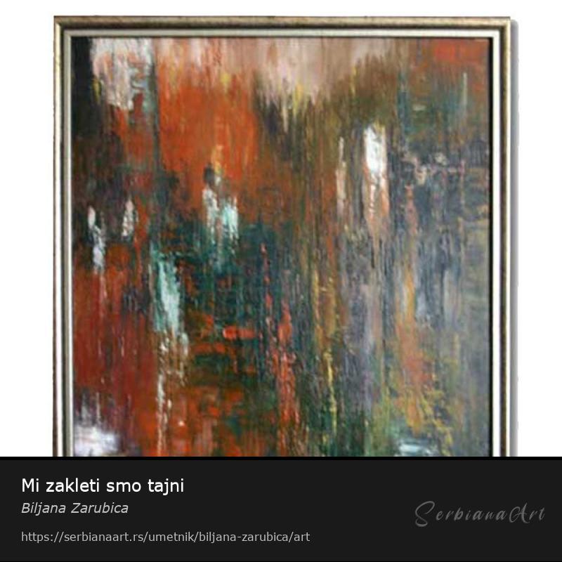 www.slika-ulje2005.comtel: +381(0)32 341 980GSM: +381(0)63 742 77 63Imam jednu vrstu sopstvene jasnoće i sreće koju sam samo ja mogla da prepoznam kod sebe. Za mene svako izgovoreno slovo i njime sklopljena reč ima određenu boju, ta boja nikad nije sama i nikad nije ista baš kao ni slovo u reči već se stalno međusobno prepliću, tako sam osetila da pored pisanog iskaza o nečemu to isto mogu da oslikam rukopisom boja i da se ta dva rukopisa slože i budu...