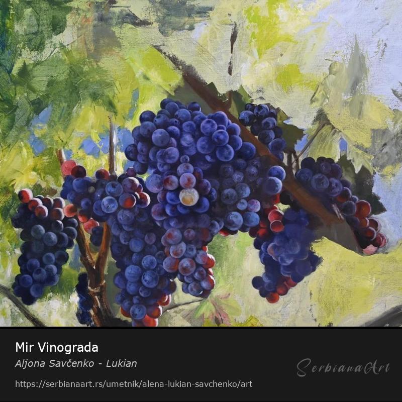 Ova slika uljem na platnu (50x60 cm) prelepo prikazuje grozd zrelog grožđa koji visi pod toplim sunčevim zracima. Bogate nijanse tamnoljubičaste i crvene živopisno kontrastiraju sa blagim zelenim i plavim tonovima pozadine, stvarajući dinamičnu i harmoničnu kompoziciju. Tekstura poteza četkice i igra svetlosti dočaravaju svežinu vinograda, izazivajući osećaj mira i obilja.