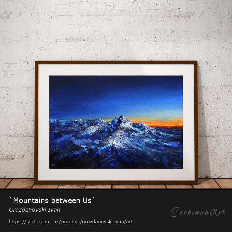 Artist's description: "Mountains between Us"..........Impressionistic style....... ....Painted with expressive moves...........with a lot of emotion!!!.. I'm giving all best, to be represent the true colors of the paintings in the photos, but sometimes you can see a little difference in tone.. I take good care packing my art,so it comes to you in the great shape. Note !!! The painting on the wall of the room is not in true scale....!!!! All my artwork is original !!!! Materials used: Acrylic ( Liquitex)..Oil (Van Gogh)... on the end covered with a satin coat of varnish, to protect it for the UV and dustPodelite i promovišite ovo delo