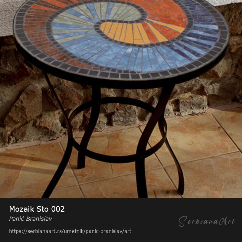 Ovaj mosaik sto napravljen je od keramickih plocica i zaliven cementom. Postolje i ram su napravljeni od metala.Podelite i promovišite ovo delo