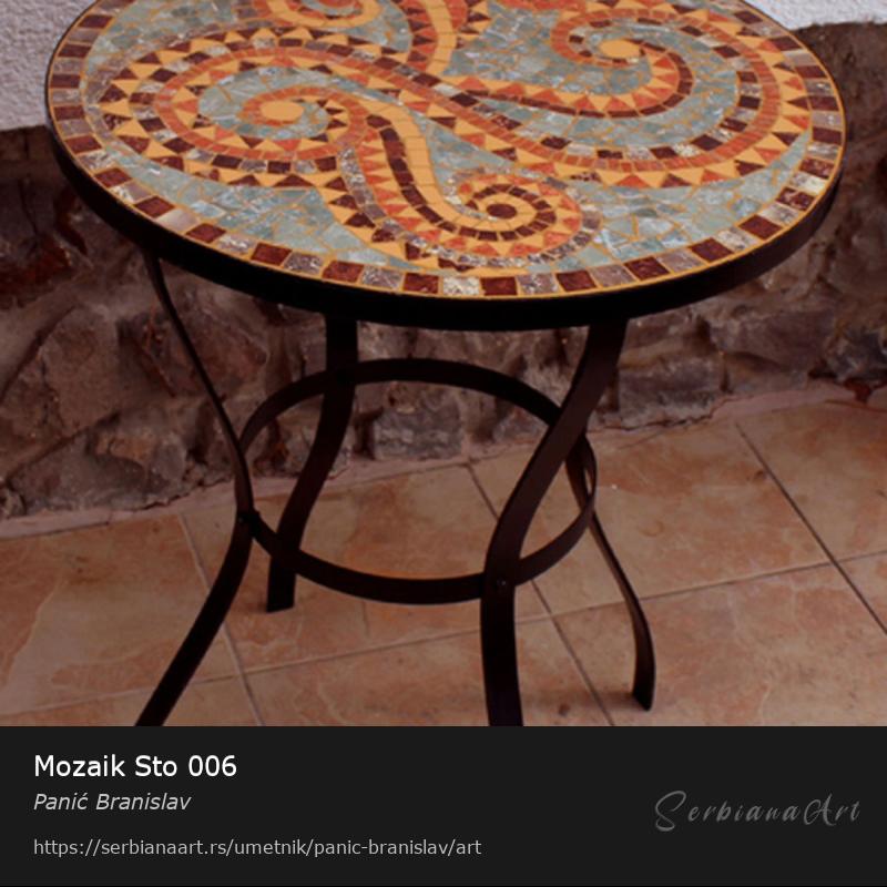 Ovaj mosaik sto napravljen je od keramickih plocica i zaliven cementom. Postolje i ram su napravljeni od metala.Podelite i promovišite ovo delo
