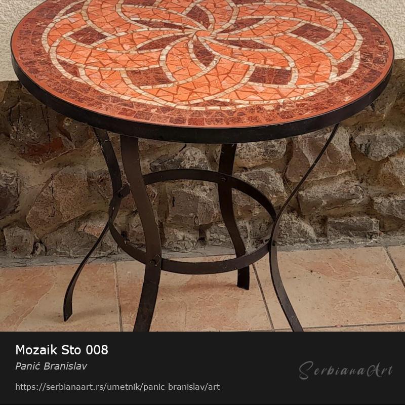 Ovaj mosaik sto napravljen je od keramickih plocica i zaliven cementom. Postolje i ram su od metala.