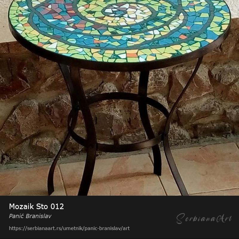 Ovaj mozaik sto napravljen je od keramickih plocica i zaliven cementom. Postolje i ram su napravljeni od metala.