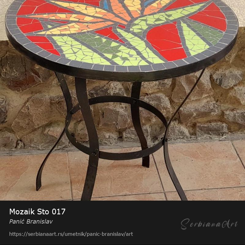 Ovaj mosaik sto napravljen je od keramickih plocica i zaliven cementom. Postolje i ram su od metala.