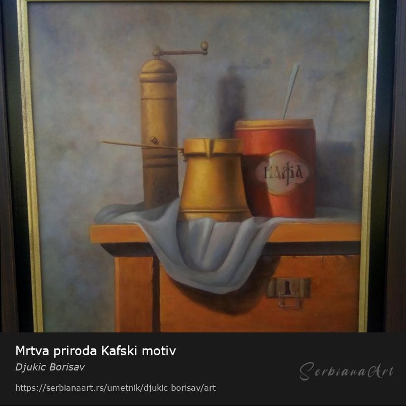 Slika je oslikana uljanim bojama na lesonit proci koja je preparirana, uramljena je sa drvenim paspatuom i lajsnom od 3 i 6 cm. Ram je kolorisan sa akrilnim bojama.Podelite i promovišite ovo delo