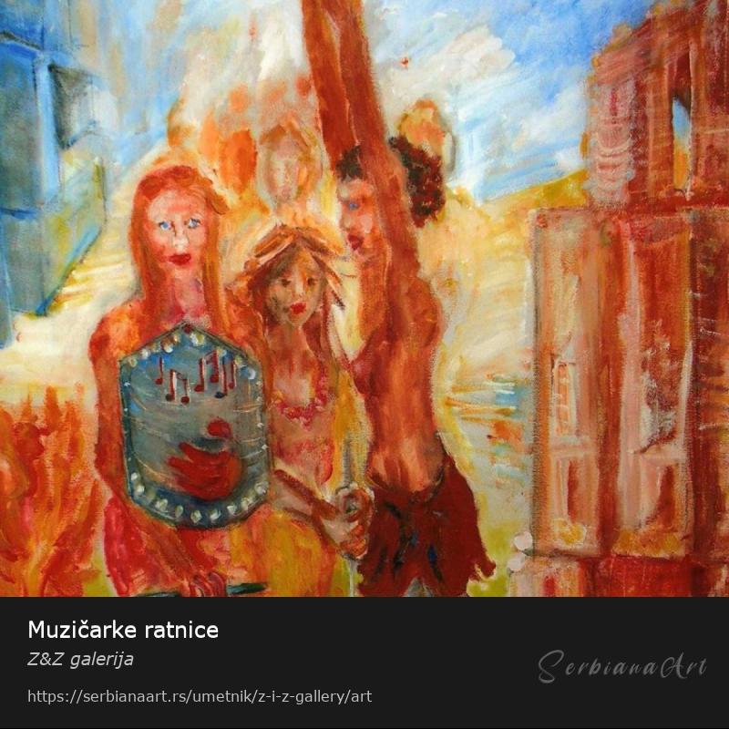 Музичарке ратнице, аутор Звездана Елезовић, акрил на платну, 70cm x 50cm. Слика је била изложена на изложби у Швајцарској