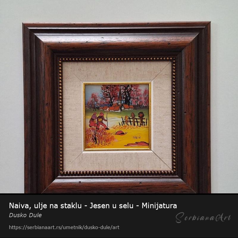Naiva, ulje na staklu Jesen u selu. Minijatura. Prelepo umetnicko delo. Slika je uramljena u jako lep, luksuzan ram. Dimenzije slike sa ramom 26 x 26. Privatna kolekcija.