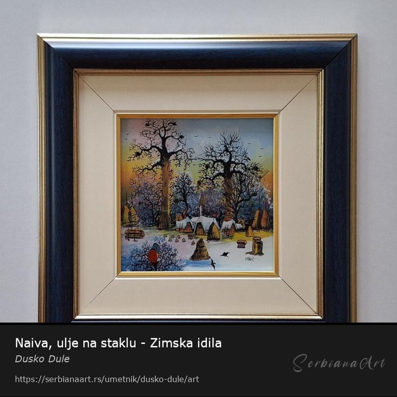 Naiva, ulje na staklu Zimska idila. Prelepo umetnicko delo. Slika je uramljena u jako lep ram, dimenzije slike sa ramom 30 x 30. Privatna kolekcija.