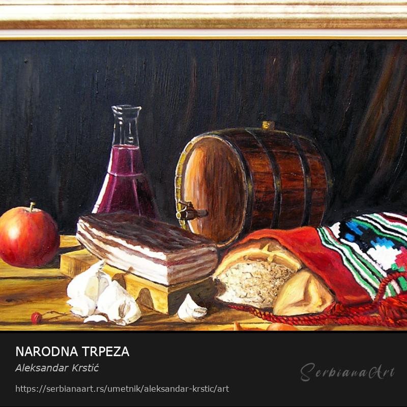 Ulje na platnu "NARODNA TRPEZA", 80cm x 60cm uramljena vrlo kvalitetnim ramom. SLIKA JE NEUPOREDIVO LEPŠA UŽIVO!!! * Autor slike: dip.diz.master Aleksandar Krstić * Naziv slike: NARODNA TRPEZA * Veličina slike: 80cm x 60cm (uramljena) * Tehnika: Ulje na platnu SVE MOJE SLIKE SU RAĐENE PRVOKLASNIM ULJANIM BOJAMA, KOJE GARANTUJU POSTOJANOST I DUGOTRAJNOST, NA PROFESIONALNO PRIPREMLJENOM PLATNU!Podelite i promovišite ovo delo