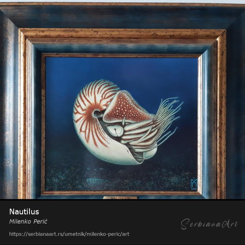 Monotipija na platnu sa doslikanim detaljima, Nautilus 21x24, uramljena, sa mesinganom pločicom.