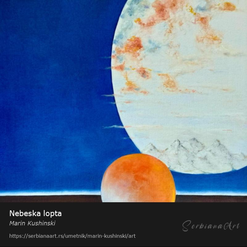Prelepa slika u tehnici ulje na platnu koja prikazuje mirnu noćnu scenu. Platno je obasjano mekim, svetlucavim sjajem mesečine, koja baca spokojnu srebrnu svetlost na pejzaž. Iznad, nebo je duboko plave boje, prelazeći u tamnije nijanse prema ivicama, stvarajući mirnu i tišinu atmosferu. Dominira tamno crvena nebeska lopta, misteriozan i nadrealan objekat koji se upečatljivo izdvaja od hladnih plavetnila noći. Kombinacija mesečine i ove živopisne crvene sfere stvara osećaj čuda i intrige, spajajući prirodnu lepotu sa kosmičkom tajanstvenošću.