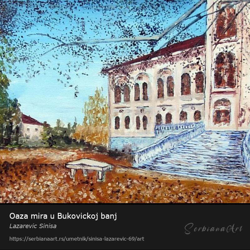 Predstavljam Vam svoju najnoviju sliku,ulje na platnu(50×40 cm), inspirisanu prelepim ambijentom Bukovičke banje u Aranđelovcu.U prvom planu,mirni park obasjan svetlošću vodi pogled ka delu čuvenog hotela Staro Zdanje,simbola elegancije i prošlih vremena.Ova slika nosi duh istorije i prirode,spoj nostalgije i bezvremenske lepote.