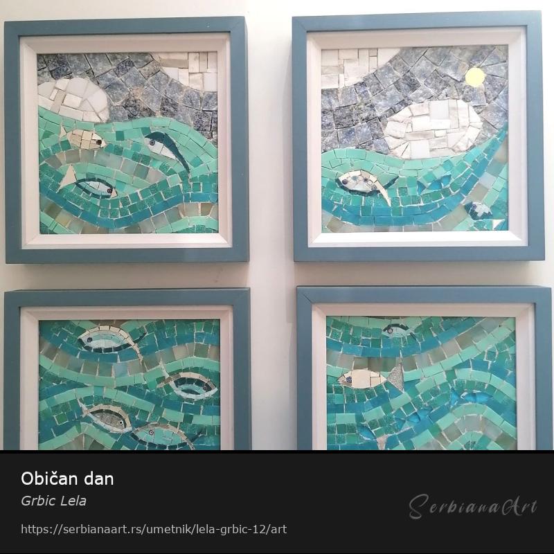 Delo čine 4 uramljena mozaika, svaki dimenzije 19x19 cm. Uramljeno 21x21 cm. Materijal: Prirodni kamen, venecijansko staklo i millefioriPodelite i promovišite ovo delo