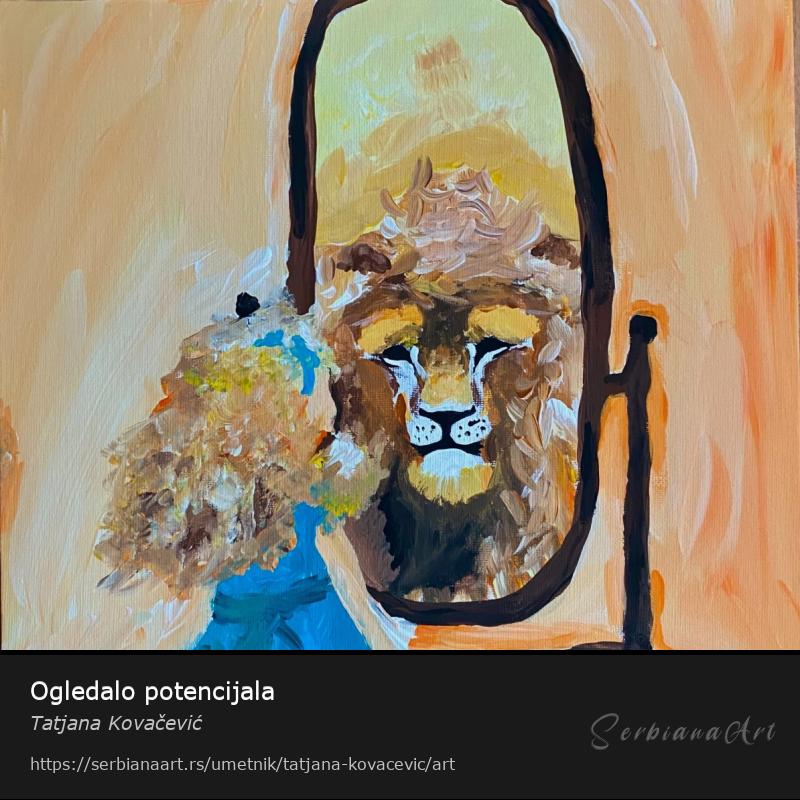 Ova slika prikazuje devojčicu koja se gleda u ogledalu i vidi lava — simbol svog ogromnog potencijala koji još ne doživljava u potpunosti. Lav, kralj životinja, predstavlja snagu, hrabrost i moć koju ona može dostići samo ako veruje u sebe i uloži trud.