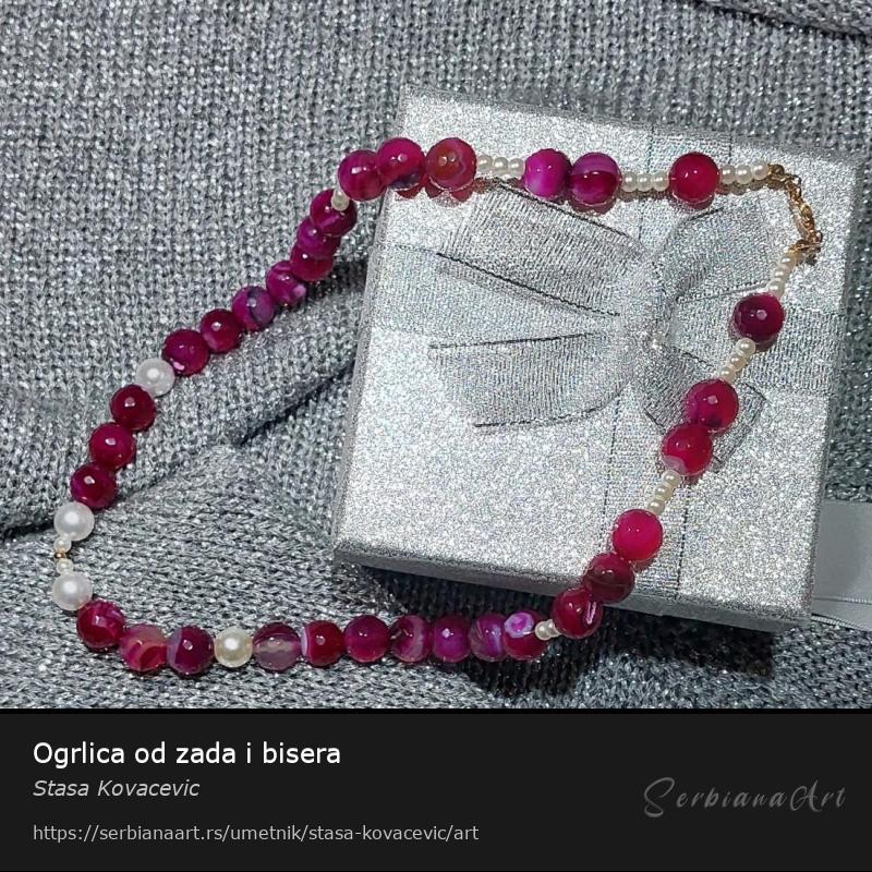 Ručno izrađena ogrlica od bisera, žada i pozlaćena kopča od nerđajućeg čelika.