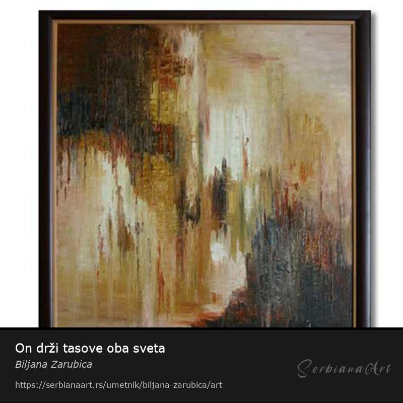 www.slika-ulje2005.comtel: +381(0)32 341 980GSM: +381(0)63 742 77 63Imam jednu vrstu sopstvene jasnoće i sreće koju sam samo ja mogla da prepoznam kod sebe. Za mene svako izgovoreno slovo i njime sklopljena reč ima određenu boju, ta boja nikad nije sama i nikad nije ista baš kao ni slovo u reči već se stalno međusobno prepliću, tako sam osetila da pored pisanog iskaza o nečemu to isto mogu da oslikam rukopisom boja i da se ta dva rukopisa slože i budu...