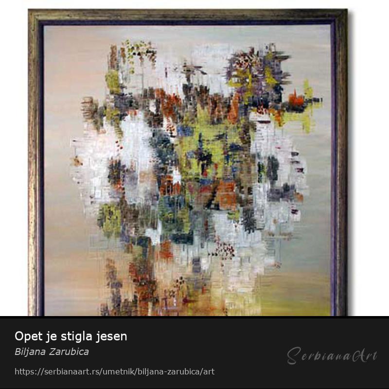 www.slika-ulje2005.comtel: +381(0)32 341 980GSM: +381(0)63 742 77 63Imam jednu vrstu sopstvene jasnoće i sreće koju sam samo ja mogla da prepoznam kod sebe. Za mene svako izgovoreno slovo i njime sklopljena reč ima određenu boju, ta boja nikad nije sama i nikad nije ista baš kao ni slovo u reči već se stalno međusobno prepliću, tako sam osetila da pored pisanog iskaza o nečemu to isto mogu da oslikam rukopisom boja i da se ta dva rukopisa slože i budu...