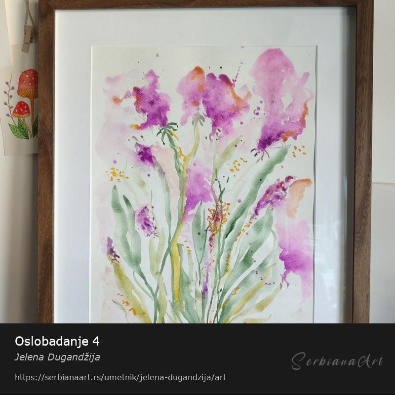 "Oslobađanje" je deo ciklusa apstraktnih slika cveća koje predstavljaju oslobađanje od pravila, prepuštanje trenutku i igru boja i vode. Lagano nastajanje ovih slika kod mene izazivaju smirenje, sreću pri kreativnom izražavanju i eksploziji boja.