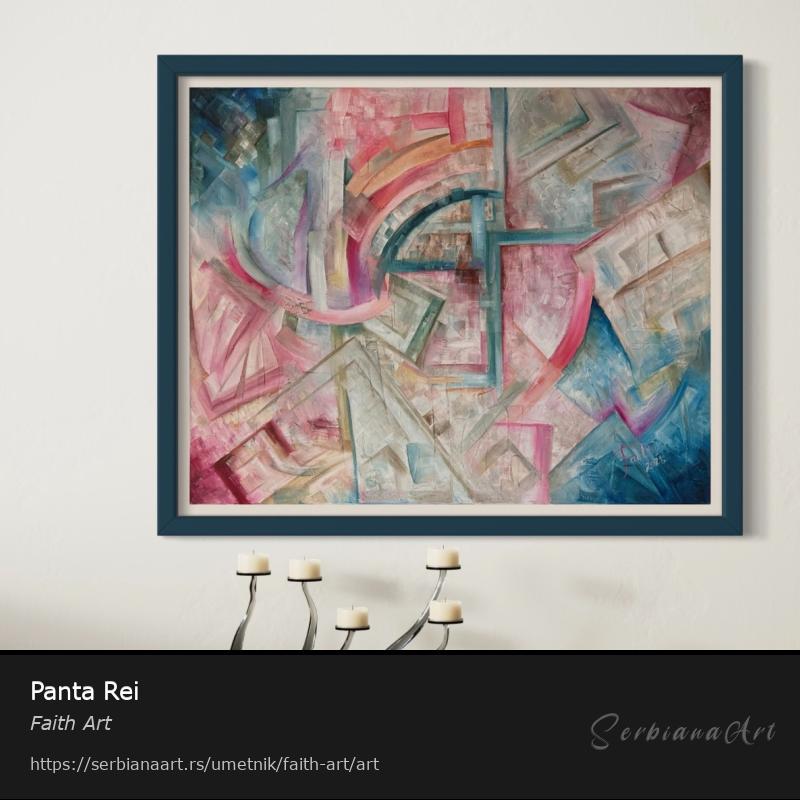 Kombinacija roze, plavih i neutralnih tonova simbolizuje cikličnost emocija, misli i vremena. „Panta Rei“ poziva posmatrača da oseti tok — ne kroz naraciju, već kroz puls boje, teksture i slojevitog značenja.