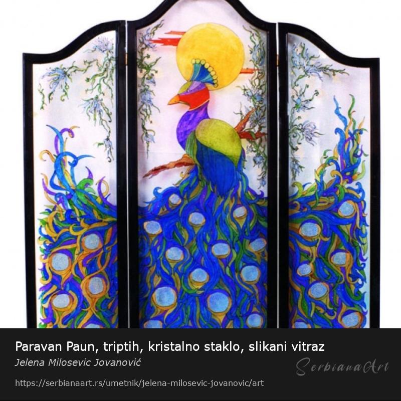Paravan Paun, triptih, kristalno staklo, slikani vitraz, dimenzije 170cm x 145cmPodelite i promovišite ovo delo