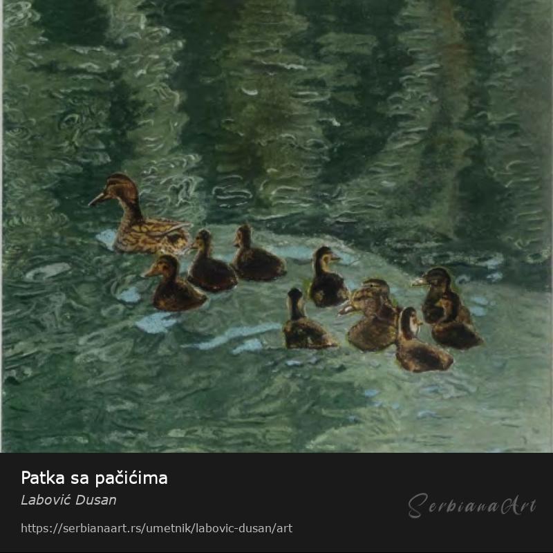 Predivna slika patke koja izvodi pačiće na plivanje . Dočarava život ptica u prirodnom okružnju , a na slici kao da se vidi užurbanost ptića dok ne dođu u zaklon šiblja.