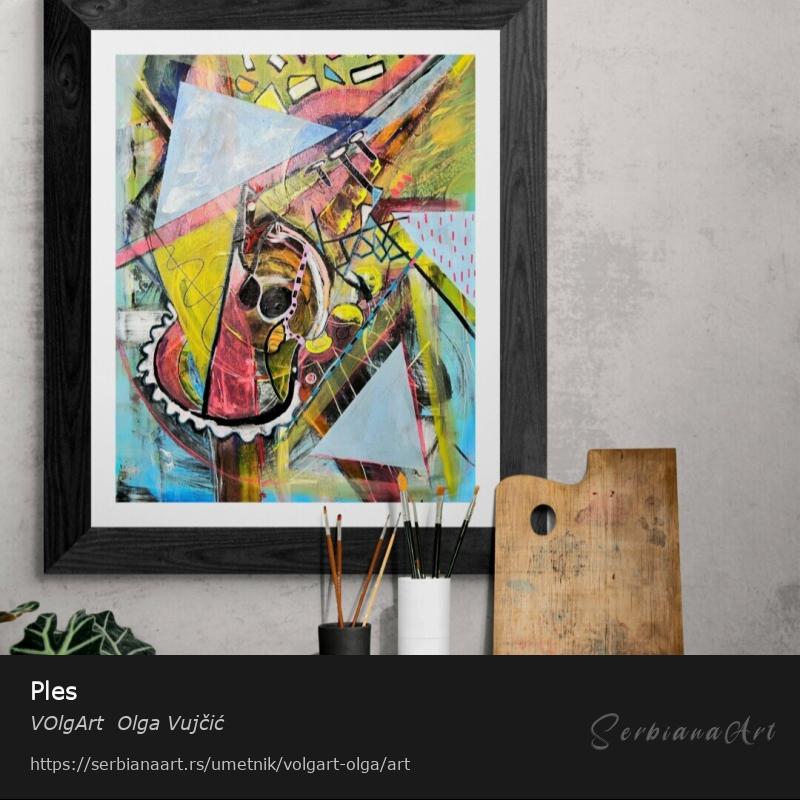 Ples" odiše energijom pokreta dok žena u središtu slike graciozno pleše. Njeno telo prepliće se u apstraktnim formama, a čipkasta suknja koja je istovremeno i štit dodaje delikatnu notu elegancije. Boje plešu zajedno, stvarajući harmoniju. Dodavanjem tri stakla u obliku trougla na slici, stvaramo simboliku koja predstavlja povezanost između žene, pokreta i života u obliku trougla, simbola ravnoteže i harmonije.