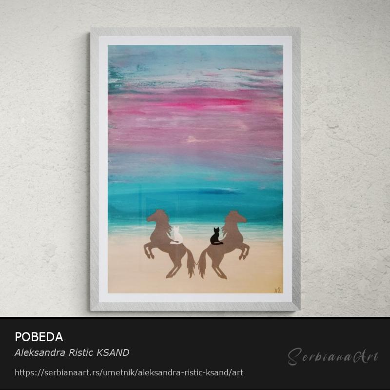 "Pobeda" prikazuje belu i crnu mačku kako sede na po jednom konju, formirajući hrabri oblik slova "V"—univerzalni simbol trijumfa. U pozadini se pruža očaravajući pejzaž plaže, vode i neba koji se savršeno stapaju u jedno, simbolizujući jedinstvo i beskrajne mogućnosti koje pobeda donosi.