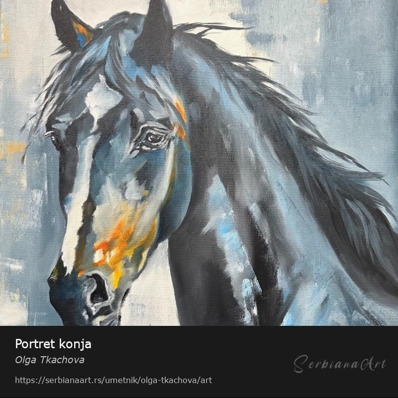 Овај мајсторски портрет у уљу приказује племенитост и моћ црног коња, његова дубока индиго нијанса истиче се на мекој плаво-белој позадини. Сваки потез четкицом доноси реализам и уметнички израз слици, док игра светлости и сенке истиче савршено извајане мишиће и живахан, интелигентан поглед ове величанствене животиње.
