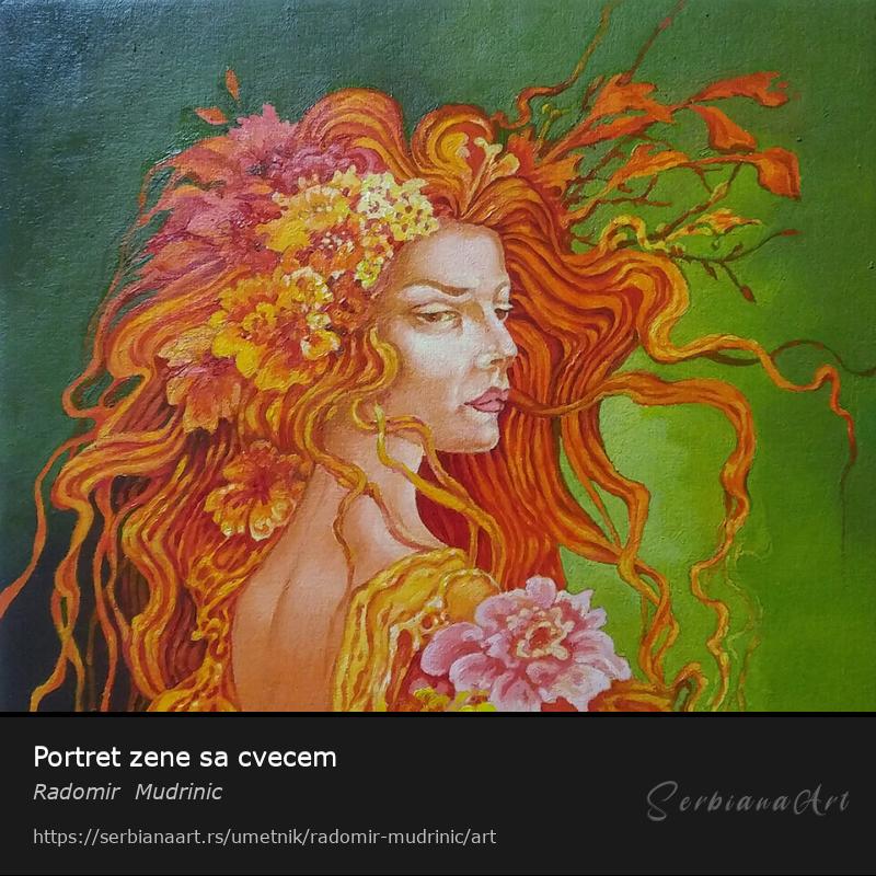 Портрет жене са цвећем је уље на касираном платну инспирисано цветним мотивом.