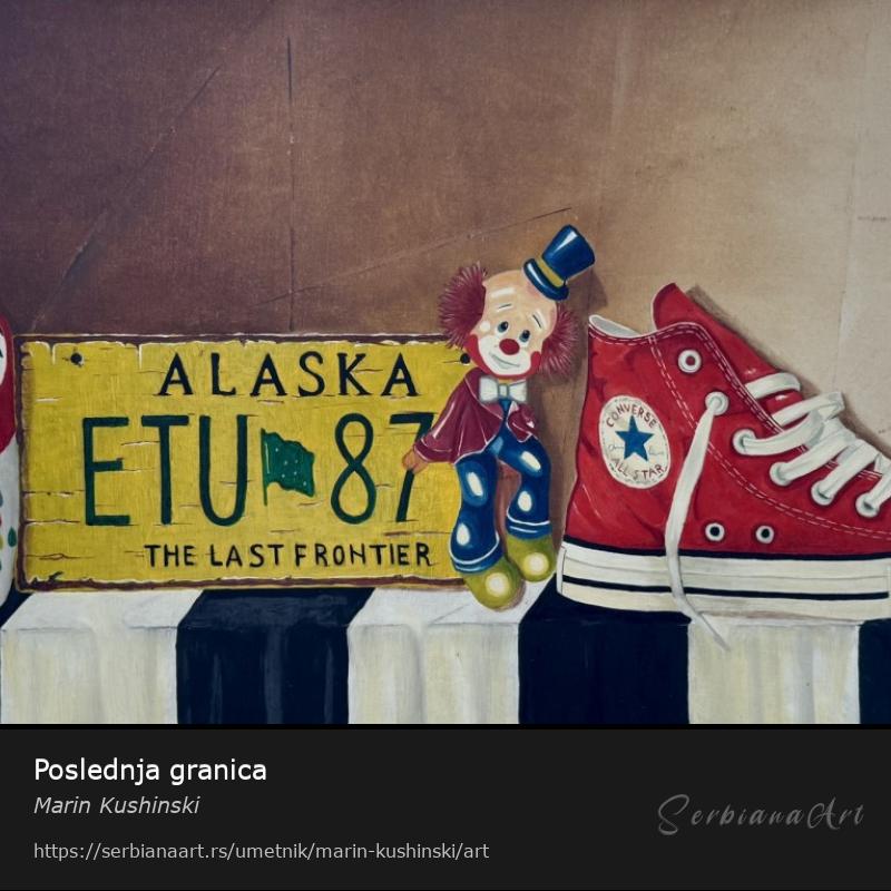 Ova slika, rađena tehnikom ulje na platnu, nosi naziv “Poslednja granica.” Kompozicija prikazuje živopisni i eklektični prikaz predmeta: tradicionalnu rusku babuška lutku u crvenoj i beloj boji, staru žutu registarsku tablicu sa Aljaske sa oznakom “ETU 87” i sloganom “The Last Frontier,” veselog klovna sa živim bojama i klasičnu crvenu Converse All-Star patiku. Ovi predmeti su postavljeni na površinu sa crno-belim prugama, što dodaje osećaj ritma i ravnoteže slici. Topla pozadina pojačava nostalgični i avanturistički ton dela, simbolizujući putovanja, kulturnu raznolikost i lične priče.