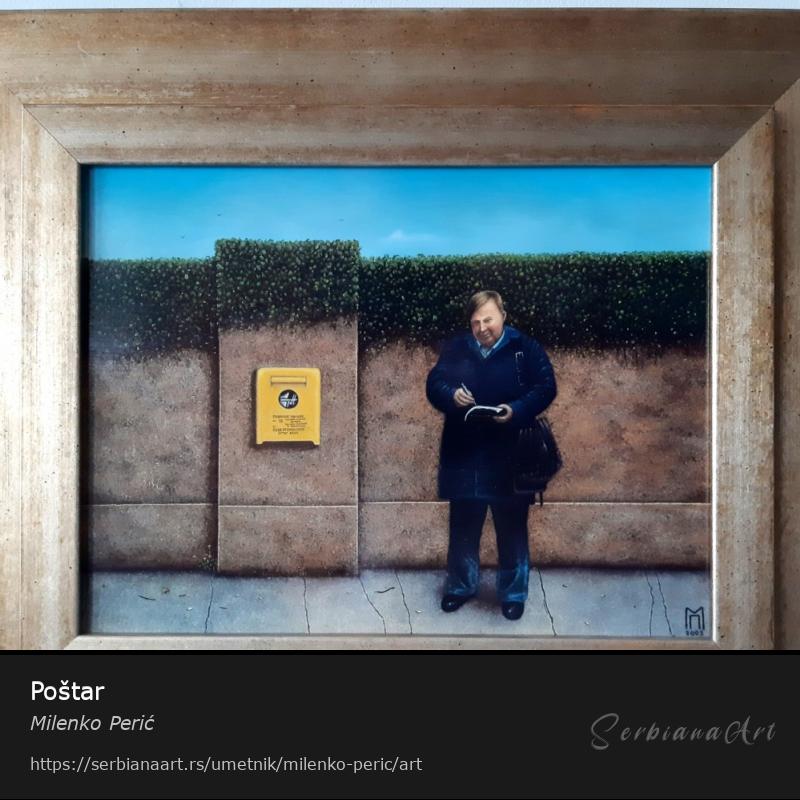 Poštar 27x35cm , monotipija na platnu sa doslikanim detaljima, uramljena, sa mesinganom pločicom.