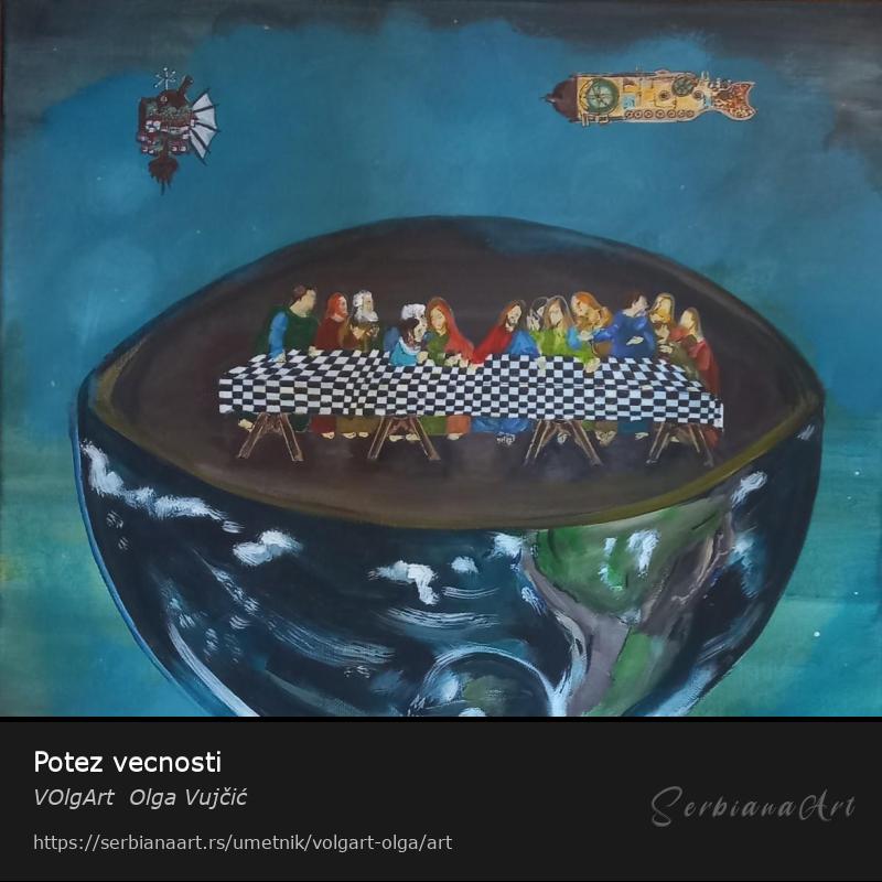 Inspirisana Tajnom večerom, smestila sam je u središte planete, usred kosmosa – jer taj trenutak nije samo prošlost, već unutrašnje mesto svakog od nas.